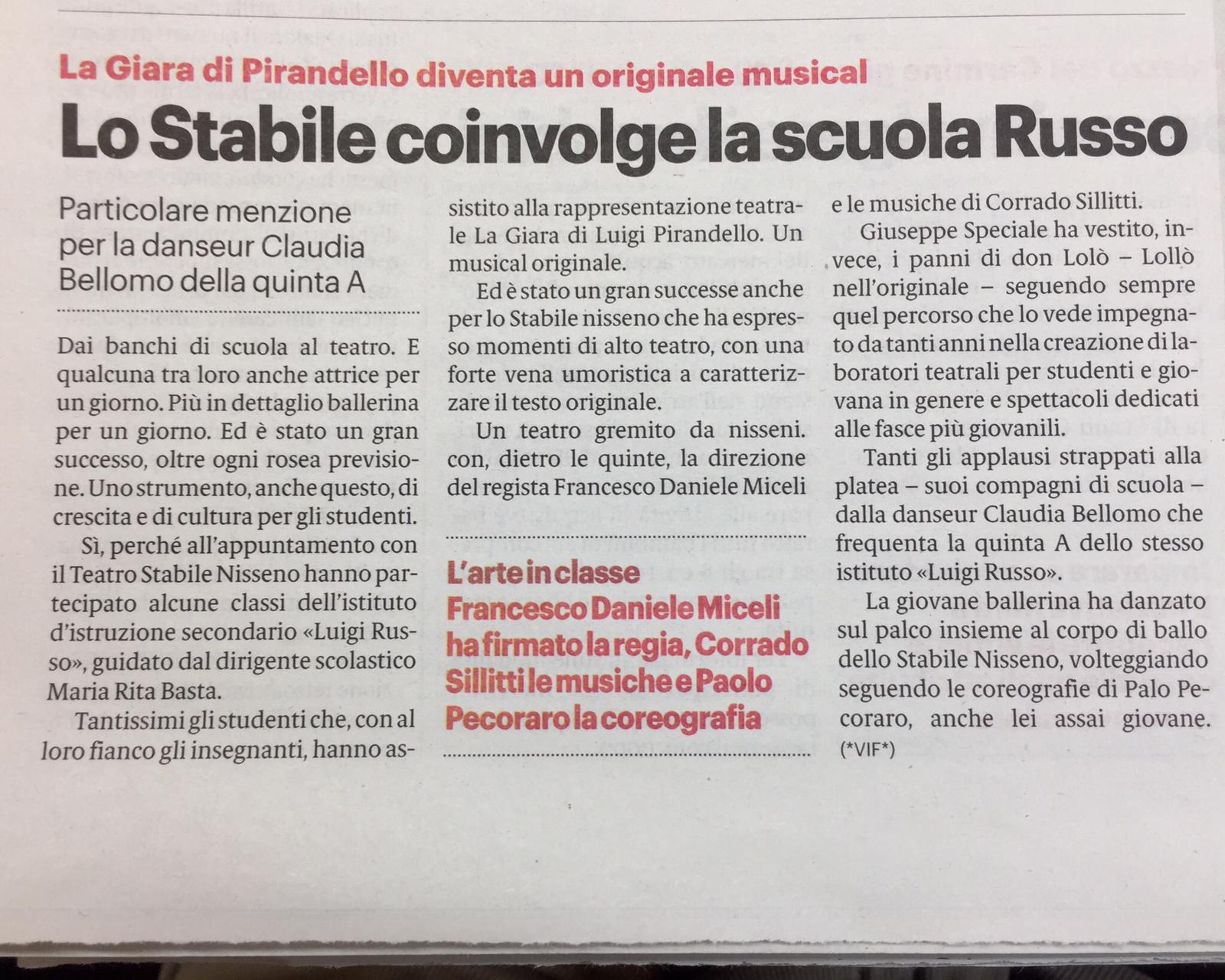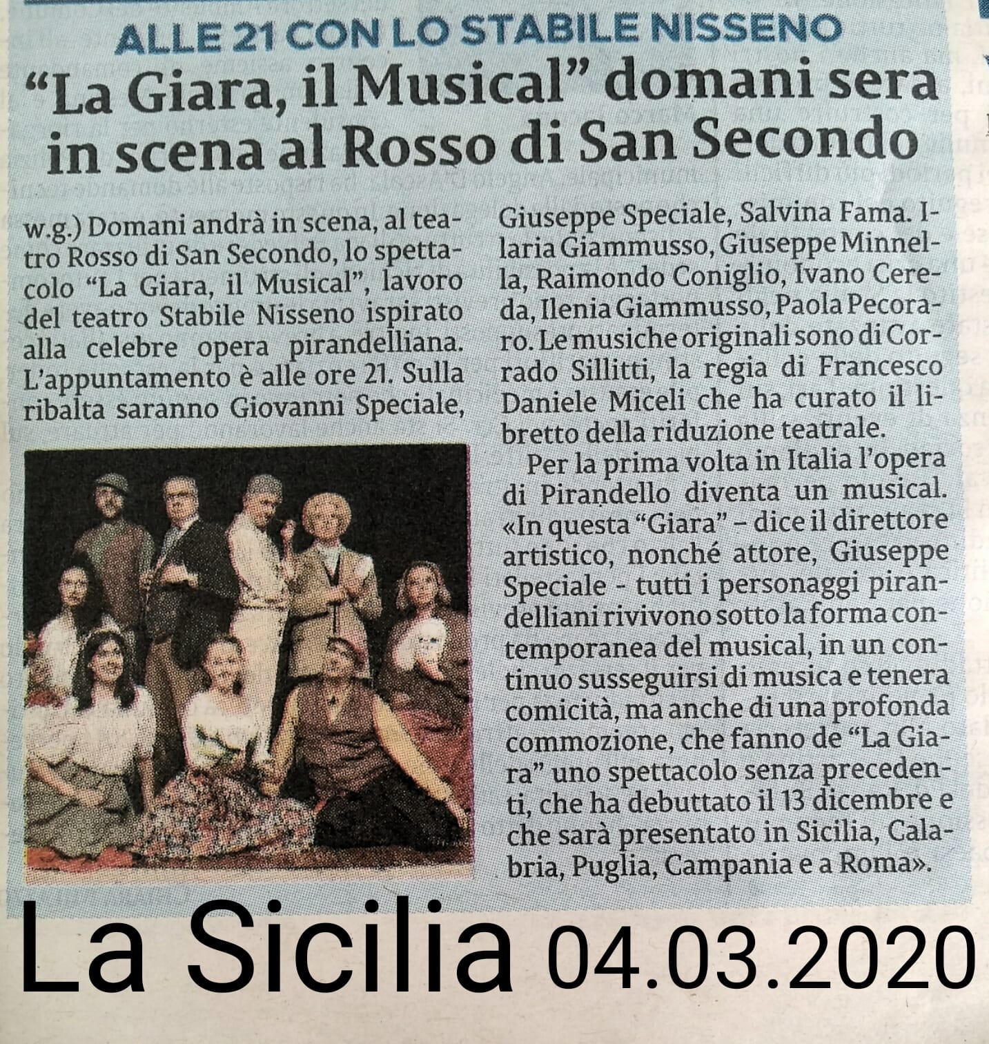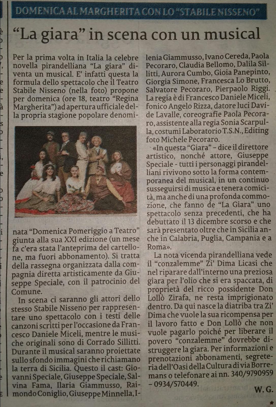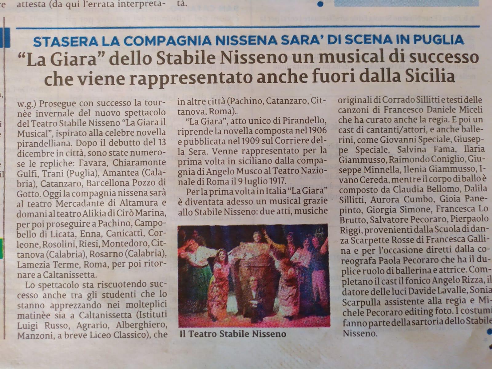 "La Giara Il Musical, 17 gennaio Cinema Teatro Impero Trani - Compagnia Teatro Stabile Nisseno di Caltanissetta. La magia del teatro, armonia dello spettacolo. Pirandello rivive con la sua profondità e ricchezza di contenuti in una rappresentazione dove musicalità, coreografia, movimento, poesia, accompagnano lo spettatore in un viaggio emozionale ed intellettuale, in cui tematiche legate anche al verismo (la robba), narrate con il supporto del coro (ricordo della commedia greca), regalano un godimento multisensoriale di colori, battute, danze, quasi un viaggio nelle atmosfere siciliane, il tutto innalzando i livelli di percezione e attenzione. Un Grazie agli organizzatori per la serata di alto livello".